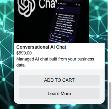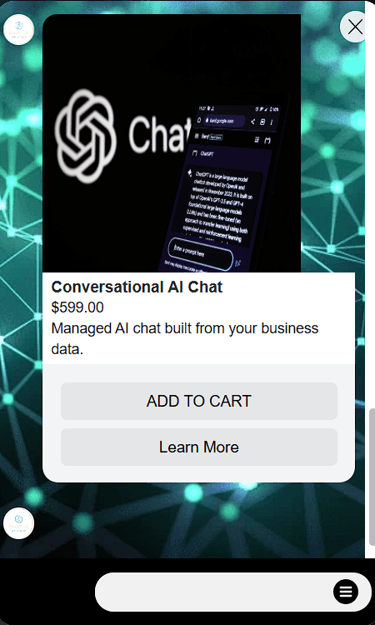 A Built in Ecommerce tool allows you to upload your products and allow users to search for and purchase within the chat.